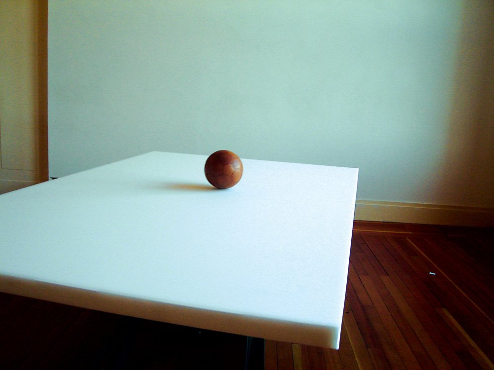 SENF: Kommen wir zur Arbeit Global Culture von Serge Spitzer. Diese zeigt einen automatisiert drehenden Tisch, auf dem ein Ball im Gleichgewicht gehalten wird.