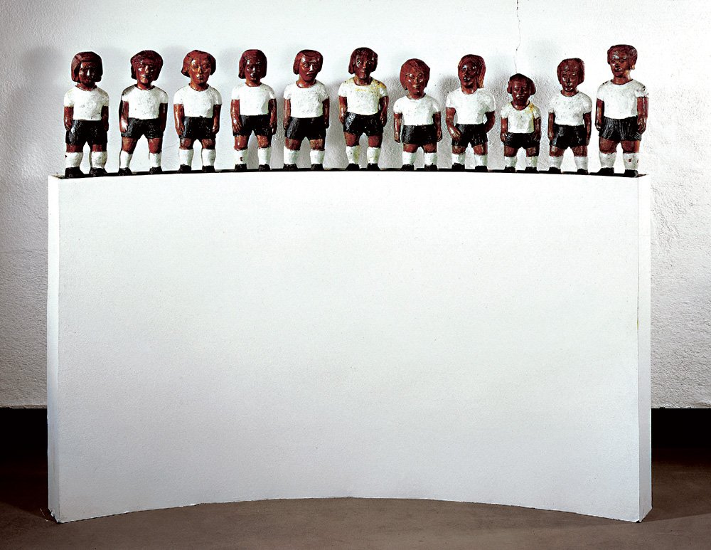 Strauss: Eine komplexe Arbeit. Eine autobiografische Arbeit, die Büttner auch mit einem essayistischen Text hinterlegt hat. Die Geschichte seines Werks beginnt am 7. Juli 1974, als die deutsche Nationalelf die Weltmeisterschaft gewinnt. Büttner war damals 20. 13 Jahre danach entstanden die Figuren der damaligen Elf für diese Arbeit. Sie halten einen Moment im Spannungsfeld zwischen Gewinnen und Verlieren fest. Es geht hier auch um Stolz, verlorene Träume, Erinnerungen und um die Suche nach den Wurzeln von Gefühlen – eine doppelbödige, starke Arbeit.