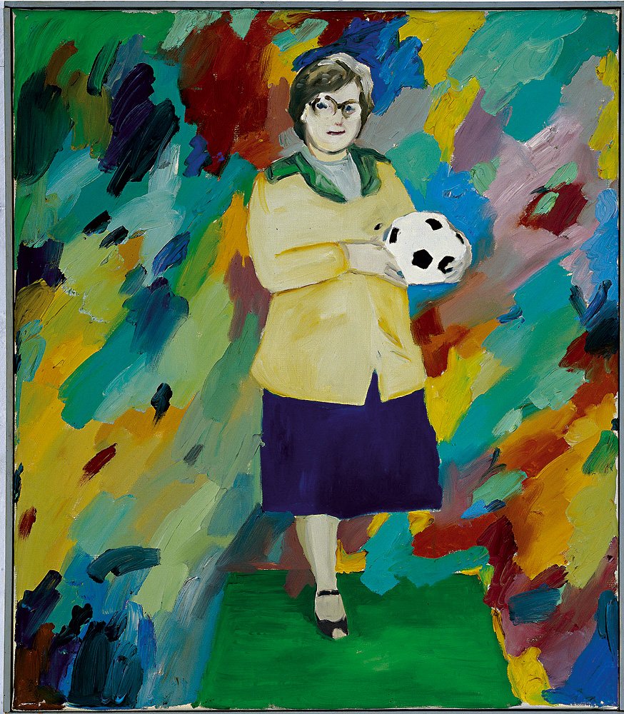 Strauss: Kippenberger war ein Künstler, der auf eine besondere Art und Weise Welten aufeinanderprallen liess. Wir sehen eine Frau, muttihaft, klischeehaft bürgerlich, ironisch; mit dem längeren Rock, der Jacke darüber, der Brille, der Frisur. Und dann hält sie einen Ball. Bürgerlichkeit und Fussball. Das ist interessant, weil es eine historische wie auch persönliche Beschäftigung mit Fussball anstösst. Fussball hat auch eine spiessige Seite. Wie ist Fussball zu dem geworden, was er heute ist? Es gab Zeiten, in denen Hochschuldozierende nur unter vorgehaltener Hand über Fussball diskutierten, weil es nicht der Sport der Gebildeten war. Kippenberger beschäftigte sich damit.