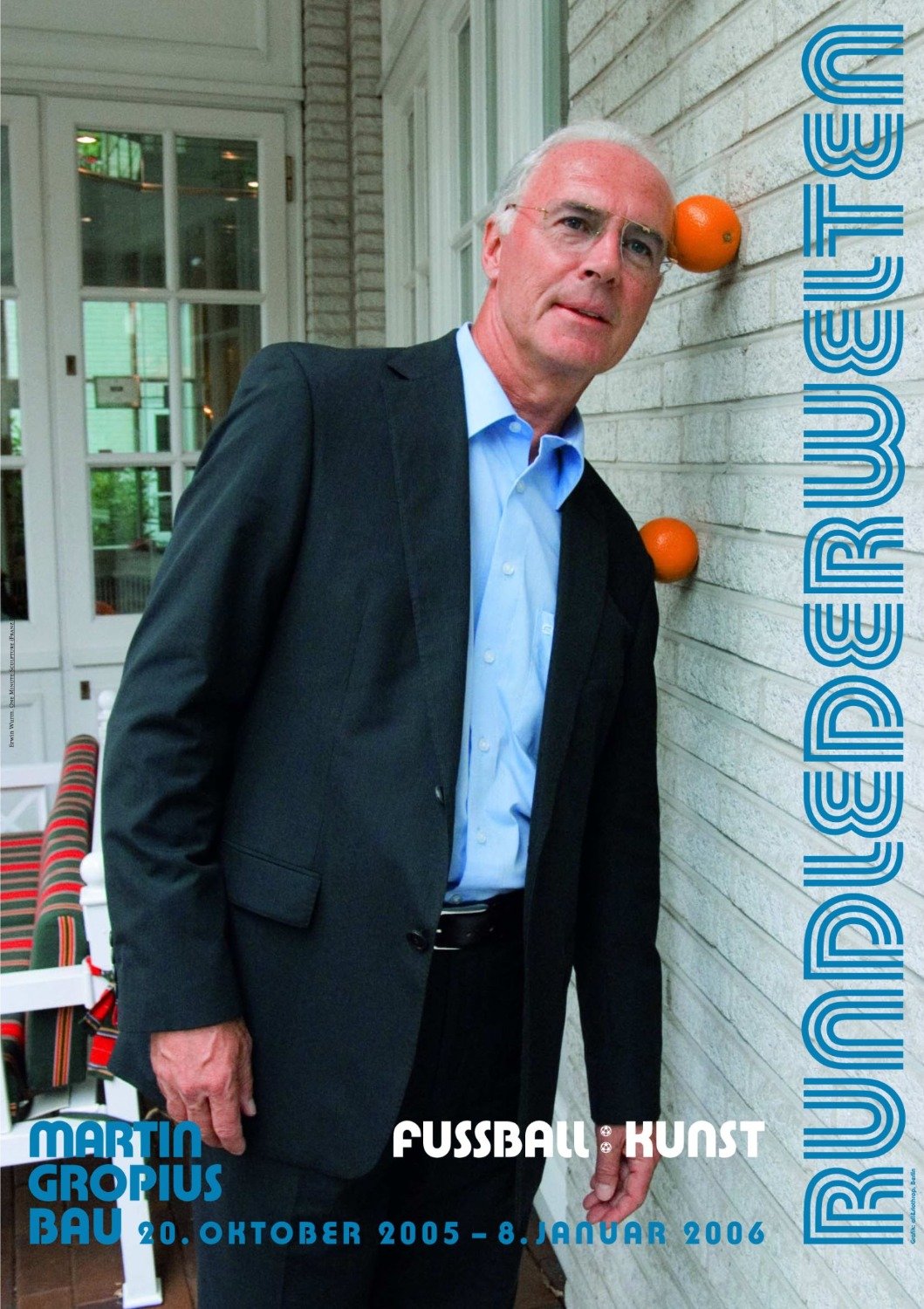 Strauss: Das Sujet wurde spezifisch für die Ausstellung entwickelt. Gemeinsam mit dem Kurator und Publizisten Christoph Doswald, mit dem ich den Ausstellungskatalog realisierte, dachte ich darüber nach, wie sich das Verhältnis von Fussball und Kunst in einem Key Visual widerspiegeln könnte. Uns schwebte eine ikonische Darstellung vor, die einerseits auch ein Kunstwerk ist und andererseits Fragen aufwerfen würde: Was ist das? Was passiert da? Ich hatte von Beginn an Franz Beckenbauer im Kopf. Dann fragten wir den international renommierten Künstler Erwin Wurm an. Wurm entwickelt seit 1988 die Werkgruppe der «One Minute Sculptures», Skulpturen für eine Minute, die jede:r selber ausführen kann. Wir brachten also zwei Ikonen zusammen: Wurms «One Minute Sculpture» und den Fussballstar Beckenbauer, denn beide sagten sofort zu. Auf einer Raststätte trafen wir uns mit den beiden – Wurm leitete an. Wer will, kann in den Früchten ausserdem den Doppelpunkt des Untertitels erkennen. Kann man so sehen, muss man aber nicht. Beckenbauer war jedenfalls begeistert.